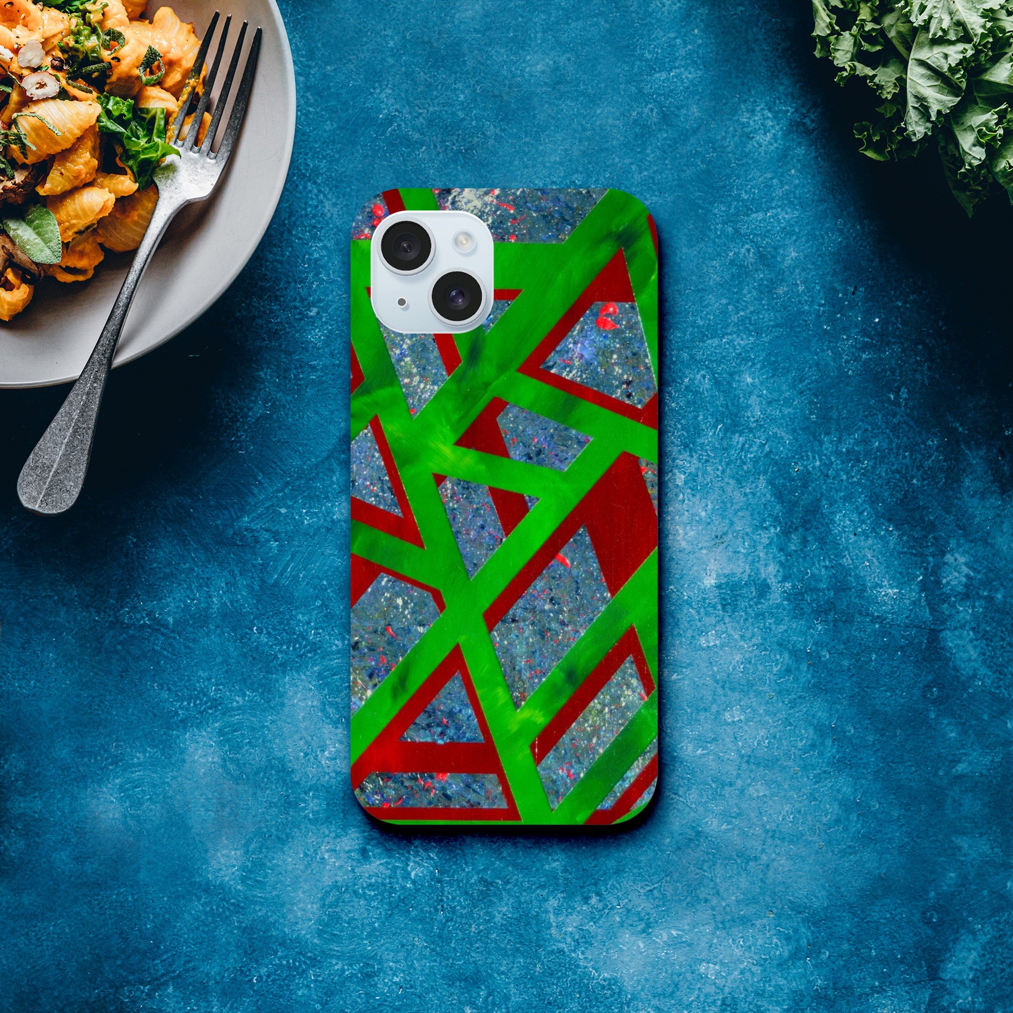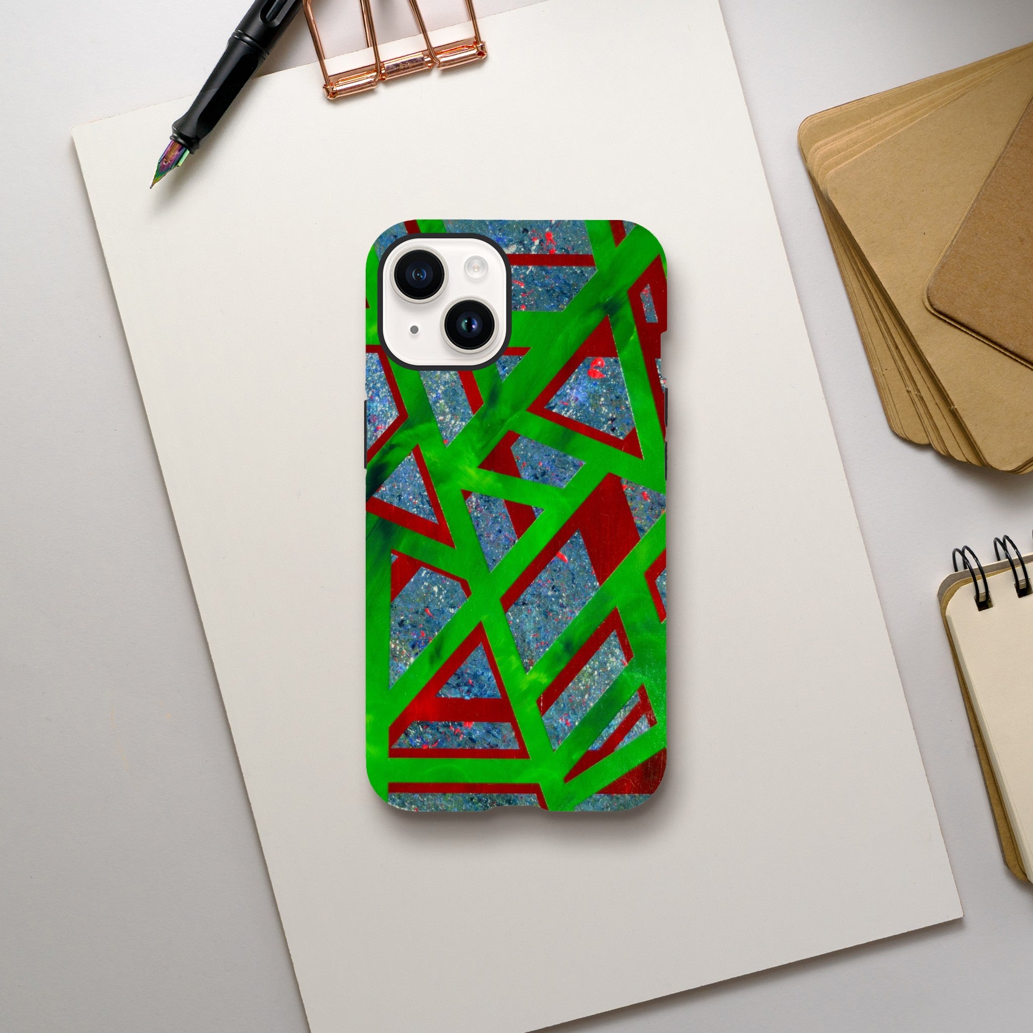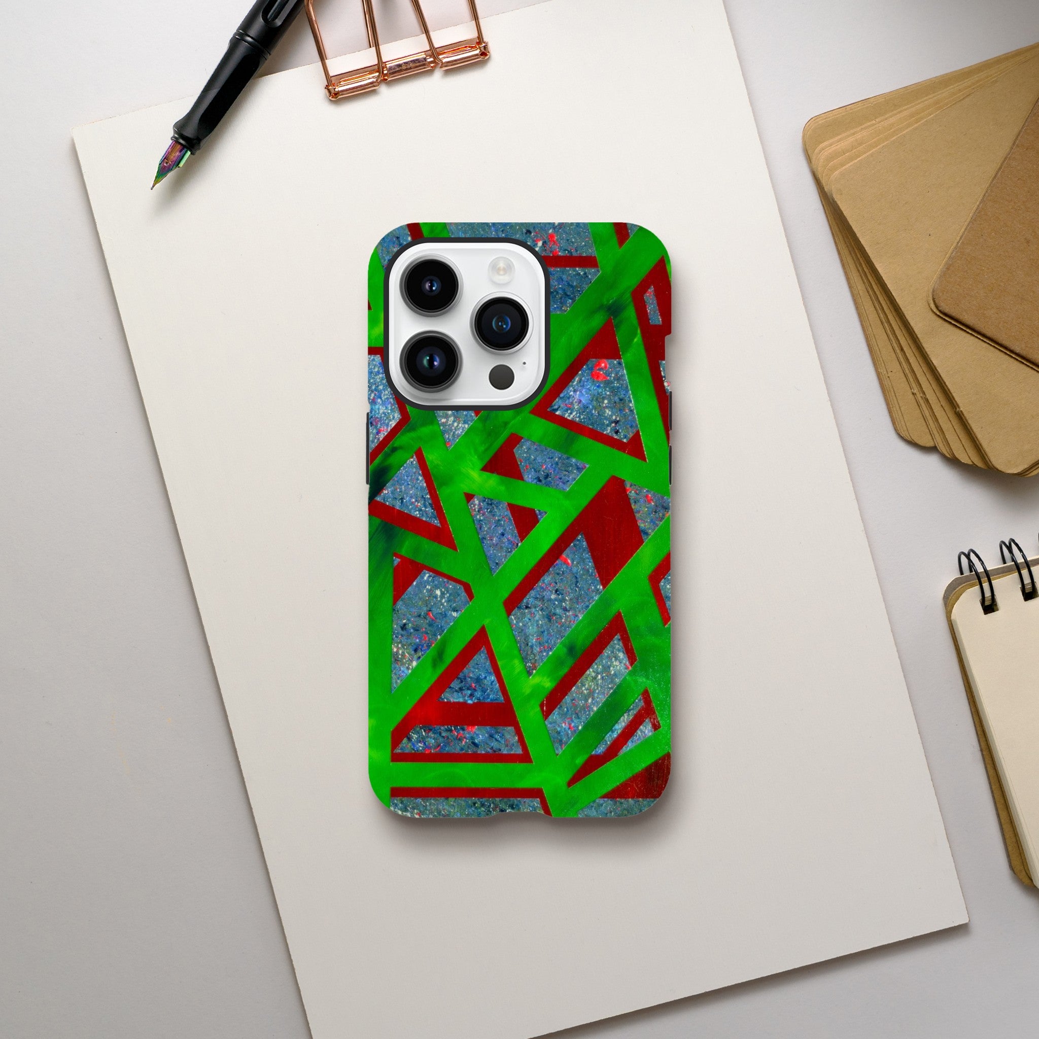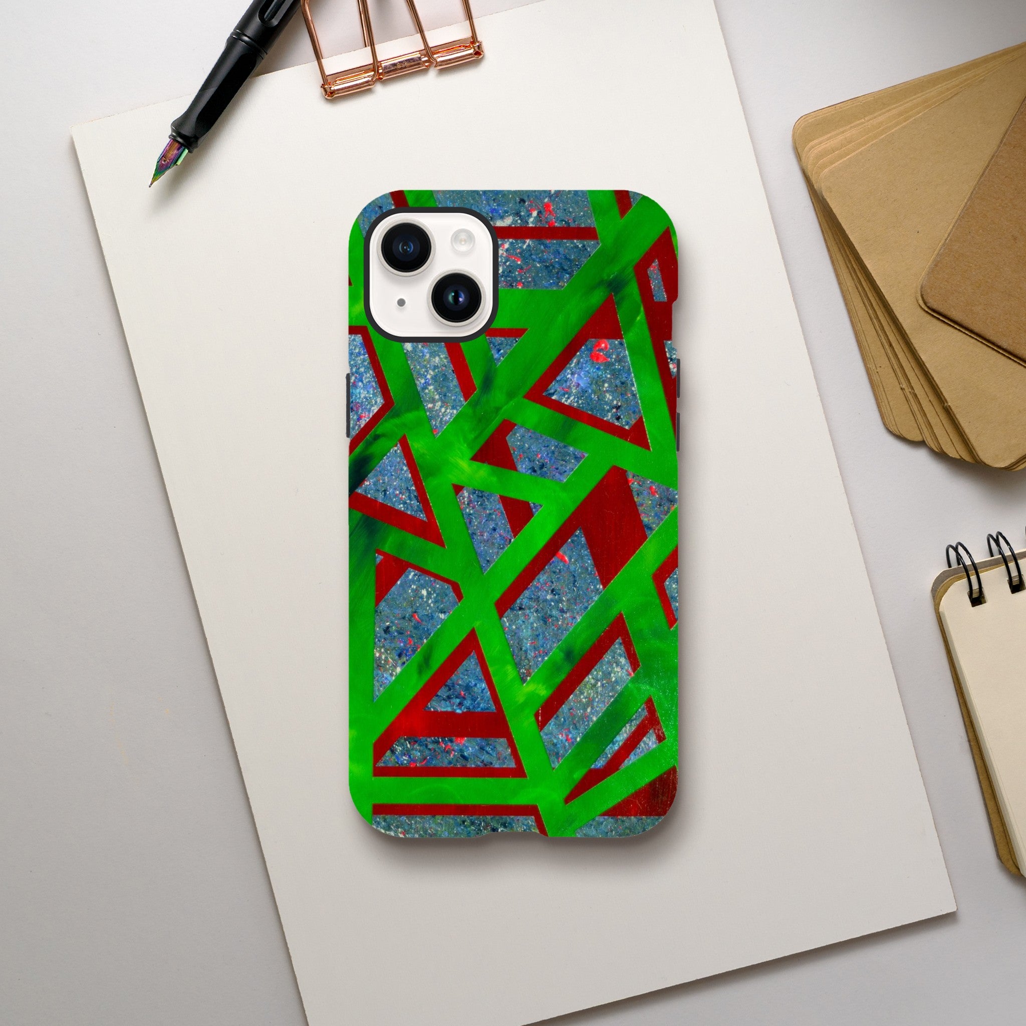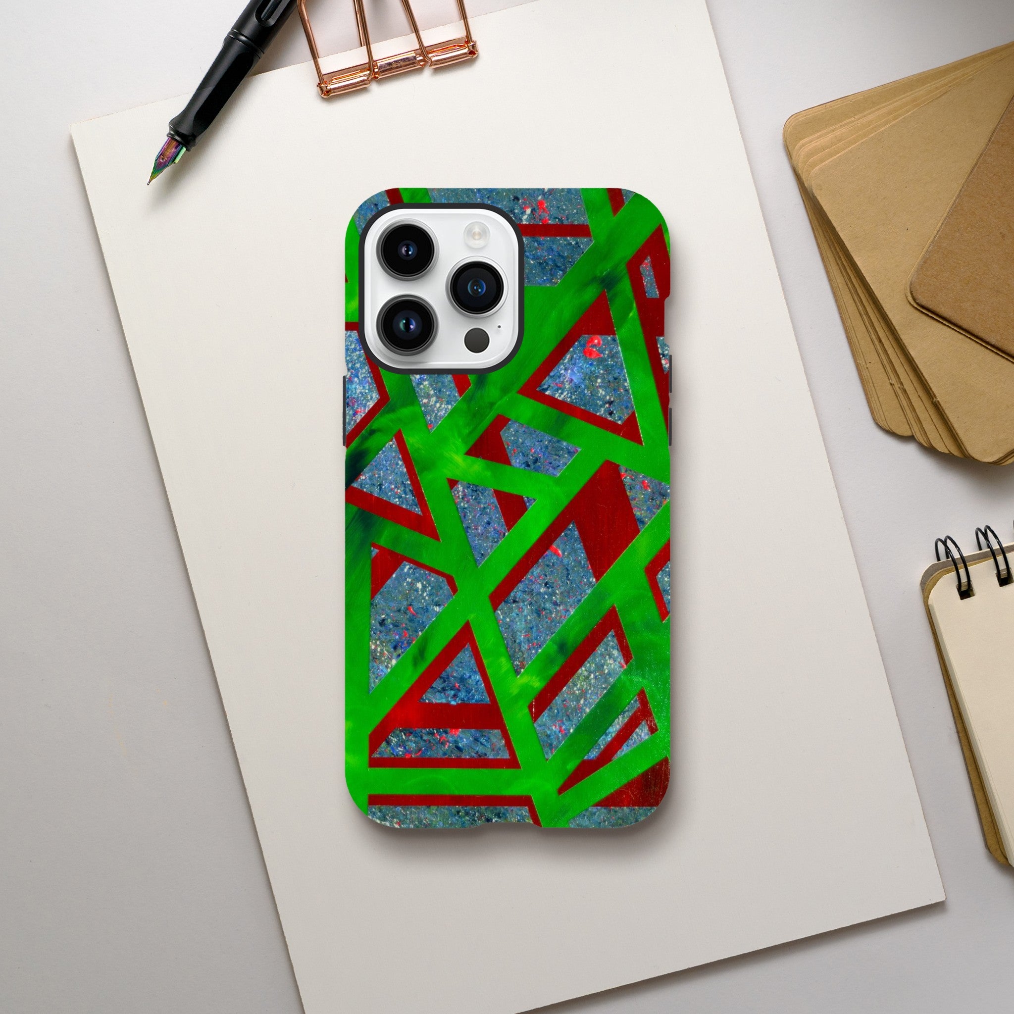 Abstract Art iPhone Case - A Walk in the Garden | Tough Case for iPhone 16, 15, 14, 13, 12 | Green & Red Geometric Design | Heavy Duty Dual Layer Protection | Unique Artist Phone Cover